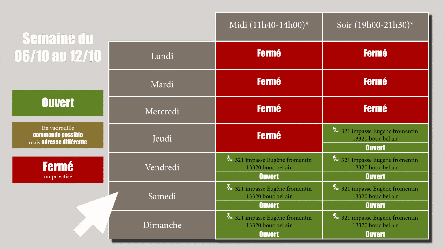 Consultez les entrées, plats, desserts et boissons disponibles dès aujourd’hui.
